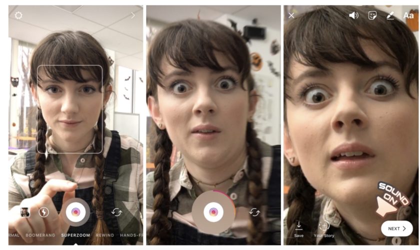 Superzoom enregistre un clip de vous, et zoome automatiquement de plus en plus en mode comique. Superzoom se trouve juste à côté de l’effet Boomerang, et comprend même une musique quelque peu lugubre. Cette fonctionnalité est utilisable directement en envoyant la vidéo par Instagram Direct à un ami, ou la partageant au sein d’une story. Ou, vous pourriez avoir vraiment envie de la faire et de la publier directement sur Instagram !