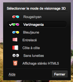 Dès lors, soit vous vous entrainez à regarder l’écran d’une certaine manière, soit vous vous procurez une paire de lunette colorée. Veuillez noter que vous pouvez sélectionner le mode de visualisation 3D pour les types de lunettes suivants : Rouge/Cyan, Vert/Magenta et Bleu/Jaune.