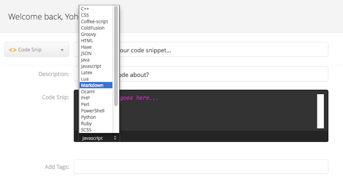 Là où Koding se démarque des autres, notamment lorsque l’on tente de convaincre une communauté de développeurs, c’est qu’il est possible de partager un bout de code appelé “Code Snip” ! Le but est le même que partager un statut, sauf que dans le cas présent vous allez pouvoir nommer votre portion de code, le décrire et bien sûr remplir le contenu de celui-ci. Concernant la coloration syntaxique, vous avez le choix entre une large quantité de langages, les principaux étant bien sûr présents. Enfin, dernier point important vous allez pouvoir taguer celui-ci de différents mots-clés. L’idée est de pouvoir retrouver les codes en fonction de ses mots-clés par la suite (nous verrons cela dans un prochain article).