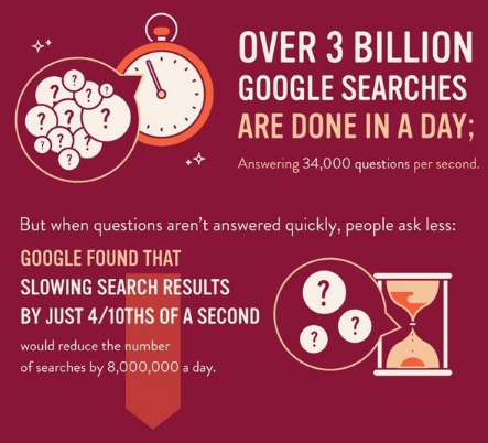 Parmi les conclusions, on peut noter de façon générale que Google gère 3 milliards de recherches par jour soit 34 000 requêtes par seconde ! Ce qui est le plus important de relever dans cette infographie c’est que si nous ne trouvons pas ce que nous voulons tout de suite, nous allons abandonner notre recherche, et ce même si les résultats prennent plus de 0,4 seconde de plus à s’afficher, dissuadant ainsi les internautes à hauteur de près de 8 millions de requêtes par jour.