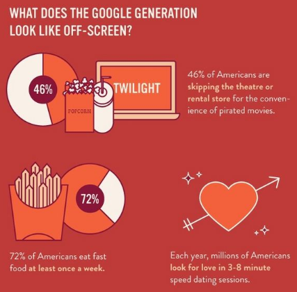 Selon l’infographie, sur les 72% des Américains qui mangent dans un fast-food, la moitié des personnes ne reviendraient pas dans un établissement qui les font trop attendre, et des millions d’Américains essayent de trouver l’amour dans des séances de chat de 3 à 8 minutes…