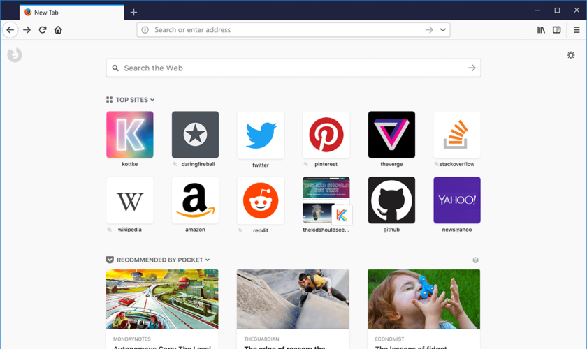 En plus des améliorations techniques, Firefox Quantum a aussi une meilleure apparence. Ceci est lié à une nouvelle interface utilisateur nommée Photon, qui présente un design moderne et minimaliste, des onglets carrés et de fluides animations. Le résultat est une interface utilisateur épurée, qui donne laisse l’impression que les autres navigateurs sont vieillissants.