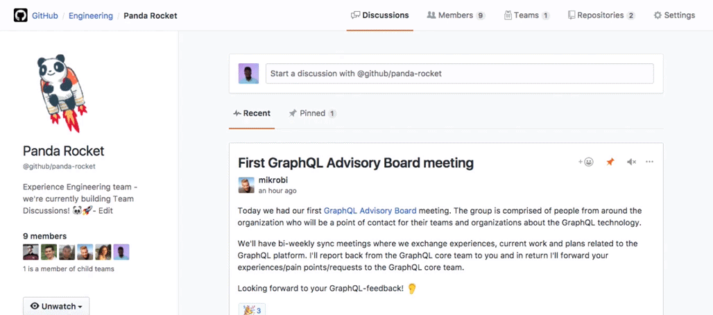 Dans le tableau de bord principal de GitHub, les utilisateurs verront une nouvelle section « Your teams », avec une vue qui peut être utilisée pour démarrer une nouvelle discussion ou rejoindre une discussion existante. Le tableau de bord supporte tous les mécanismes habituels de feedback, tels que les emojis.