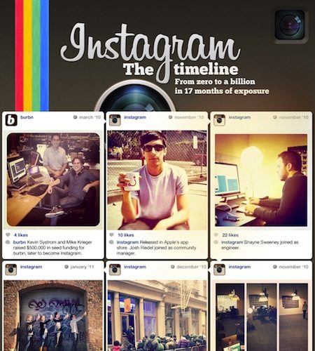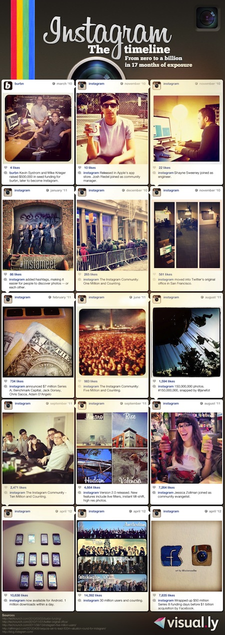 Pour se faire, les concepteurs de Visual.ly ont compilé une infographie qui retrace du lancement de l’application au rachat de celle-ci, les différentes étapes de son succès. Et le moins que l’on puisse dire c’est que celle-ci est visuellement appropriée puisqu’elle reprend des photos d’Instagram !