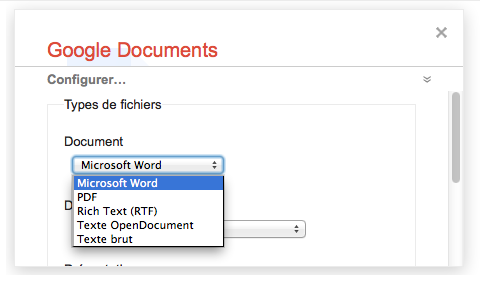 Utilisez la fonction “Configurer” du menu si vous souhaitez choisir différents formats pour vos documents. Vous pouvez également sélectionner les types de fichiers que vous souhaitez sauvegarder : documents, dessins, présentations et feuilles de calcul, etc…