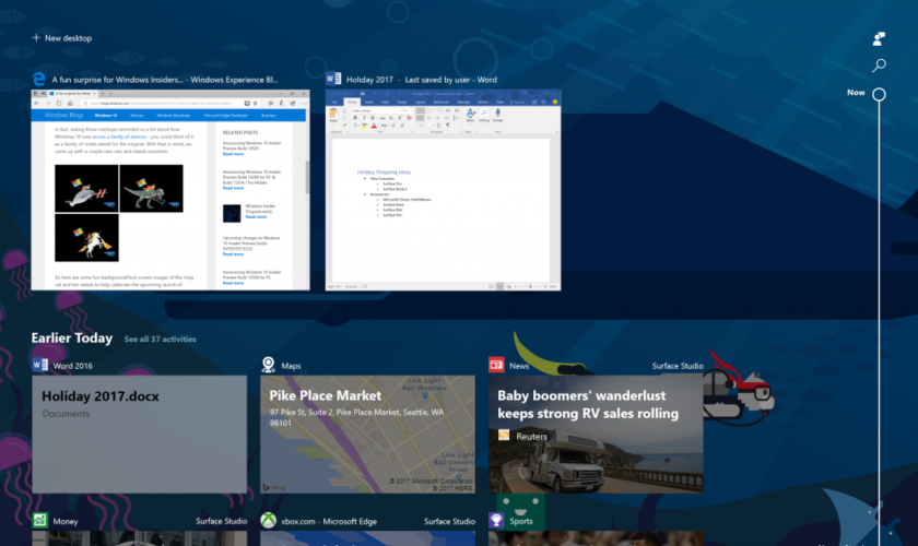 Les utilisateurs peuvent également parcourir les choses qu’ils ont effectuées plus tôt dans la journée ou revenir à une date antérieure bien précise. Les activités, telles que les fichiers consultés, les articles lus et les cartes consultées, s’affichent dans Timeline sous forme de liens exploitables, ce qui signifie qu’un clic vous ramène à ce contenu. La version preview de cette fonctionnalité prend en charge les fichiers ouverts par des applications Microsoft telles qu’Office, les pages Web ouvertes dans Edge et les versions universelles UWP de Météo/Sport/Cartes/Finance/Actualité.
