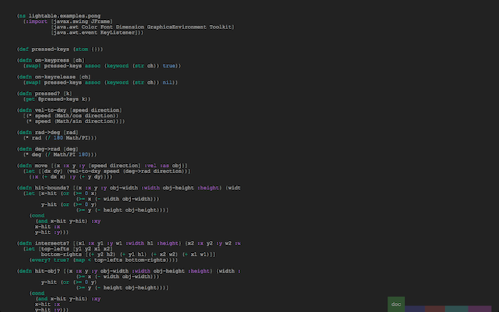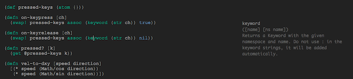 Lorsque vous êtes à la recherche d’un nouveau code, il est extrêmement précieux d’être en mesure de voir rapidement la documentation laissée par l’auteur. Normalement, pour ce faire vous devriez naviguer à la définition de la fonction, mais grâce à Light Table cette information va se retrouver sur le côté.