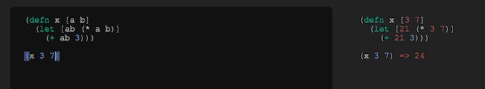Par exemple, si vous tapez le code (+ 3 4), vous allez immédiatement voir qu’il évalue la sortie à 7, et ce sans avoir besoin de faire un Ctrl + Entrée par exemple. De plus, l’IDE ne vous montre pas seulement l’état des variables sur le côté, mais en fait, vous montre comment le code est exécuté. Ce niveau d’évaluation en temps-réel et de visualisation, peut être vue comme un débogueur temps-réel, vous permettant de tester rapidement diverses modifications et regarder comment celles-ci s’exécutent au sein de votre code. Il n’y a pas de moyen plus rapide pour identifier les bugs que de visualiser le résultat de votre travail !