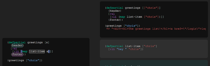 Ainsi, le “mode lumière” de Light Table vous permet de visualiser quelles sont les fonctions utilisées à l’intérieur de votre code, non seulement en les mettant en évidence, mais aussi en vous montrant leur contenu sur le côté.