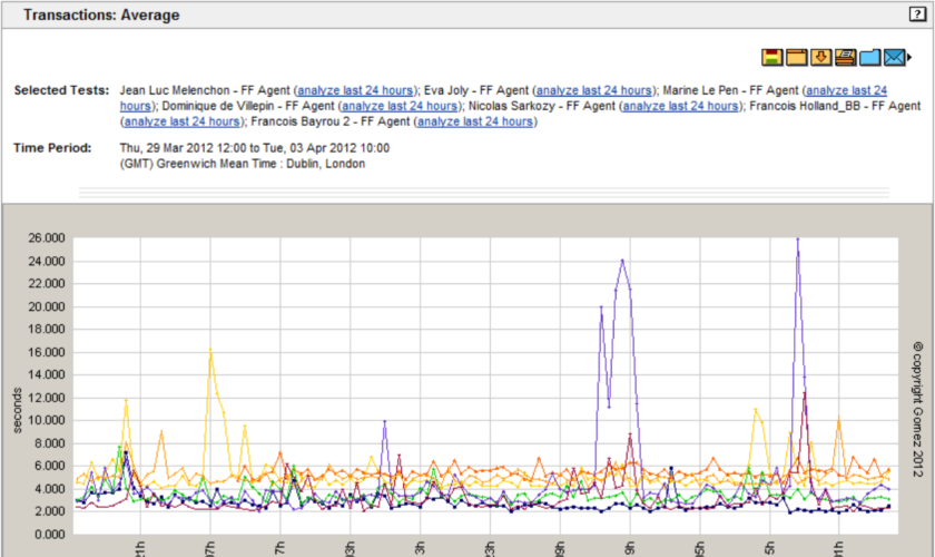 Pour répondre à ces questions, la performance et la disponibilité des sites web des principaux candidats ont été mesurées du 29 Mars au 3 Avril par Compuware, le spécialiste de la performance applicative.