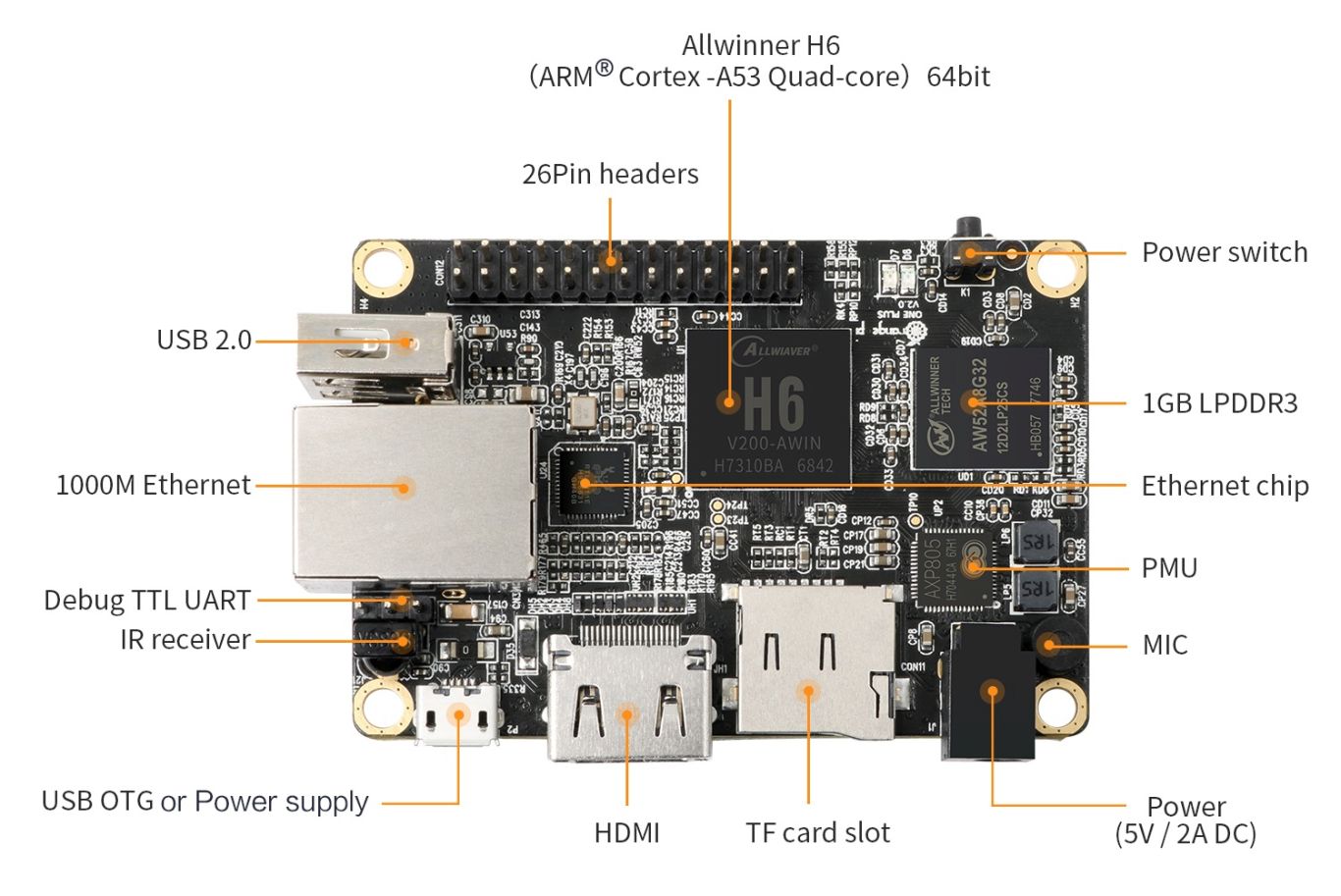 Il y a aussi une prise d’alimentation, un connecteur à 26 broches pour étendre les capacités du PC avec des cartes d’extensions, et le tout mesure seulement 68 x 48 mm, et pèse 50 g. Au lancement, le Orange Pi One Plus prend uniquement en charge Android 7.0, bien les développeurs espèrent pouvoir utiliser Ubuntu et/ou Debian Linux sur les périphériques. S’il y a déjà une image Linux disponible pour la plupart des autres produits de Orange Pi, c’est la première fois que la firme utilise la puce Allwinner H6.