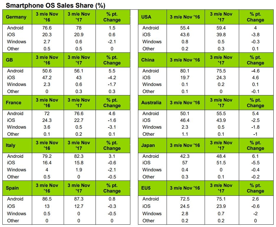 Et, les statistiques fournies par Kantar durant la période de trois mois se terminant en novembre 2017 indiquent que c’est effectivement le cas. En effet, les dispositifs Windows Phone approchent de 0 % de part de marché, même en Europe où le système d’exploitation mobile de Microsoft a été plus performant qu’ailleurs.