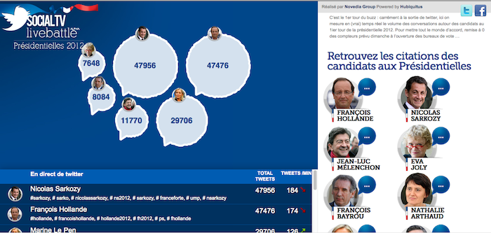 Ainsi, un site dédié a été mis en place pour fournir en temps réel le suivi du volume de tweets lié aux élections, avec des compteurs réinitialisés tôt ce dimanche matin pour coïncider avec l’ouverture des bureaux de vote. Vous allez pouvoir retrouver les derniers chiffres de la cote d’un candidat simplement en vous rendant sur ce site : http://presidentielle.socialtv-livebattle.fr/.