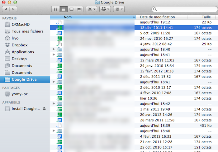Sur le bureau, Google Drive fonctionne comme Dropbox et le nouveau SkyDrive de Microsoft. Ainsi, il crée un dossier spécial, nommé “Google Drive” qui se synchronise automatiquement. Au premier abord il est étrange de voir des fichiers aux extensions .gdoc et .gsheet dans le système de fichiers de notre OS. En fait, ce qui est différent des autres fichiers, c’est que ces derniers s’ouvrent directement dans votre navigateur et plus particulièrement dans Google Docs.