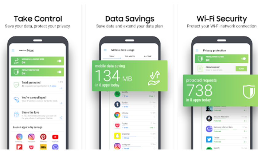 Comme avec Opera Max, il y a deux principaux domaines sur lesquels Samsung Max est axé : enregistrer des données et protéger la vie privée. En mode d’enregistrement de données, Samsung Max vous indiquera quelles applications utilisent le plus de données et pourra compresser automatiquement des images, des vidéos et des pages Web pour enrayer l’utilisation intensive des données. Vous pouvez également vous appuyer sur l’utilisation des données consommées en arrière-plan par d’autres applications. Par conséquent, si vous ciblez un problème de données, Samsung Max pourrait être un bon moyen de le maîtriser.