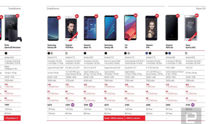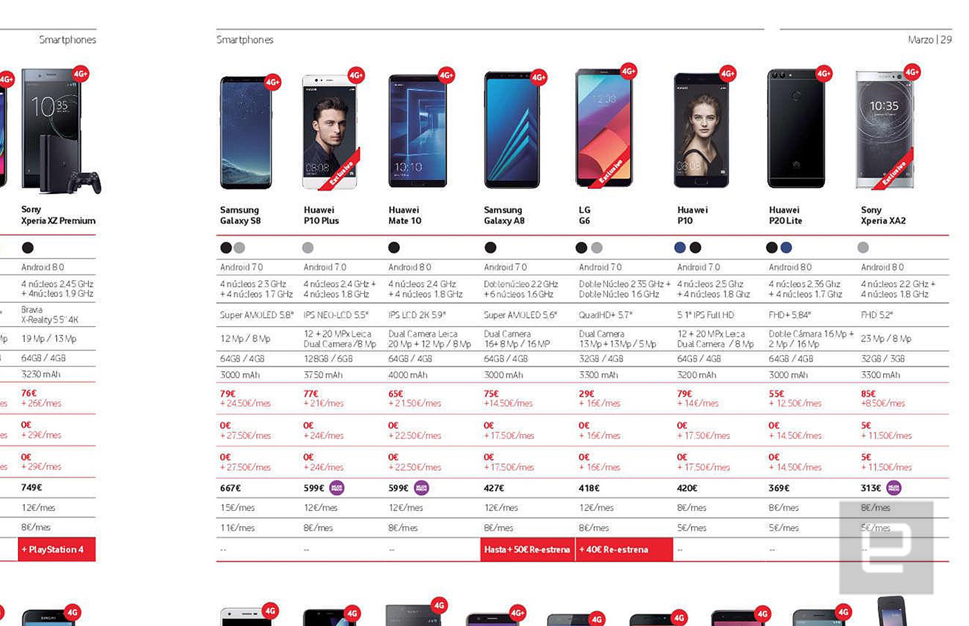 Engadget a noté que le catalogue du mois de mars de Vodafone Espagne répertorie le Huawei P20 Lite, avec une liste partielle de ses spécifications, laissant entendre que le smartphone aura un écran de 5,84 pouces d’une résolution full HD+, d’un processeur octa-core avec quatre cœurs cadencés à 2,36 GHz et quatre à 1,7 GHz, de 4 Go de mémoire vive (RAM) et d’une caméra arrière à double objectif avec des capteurs de 16 et 2 mégapixels.