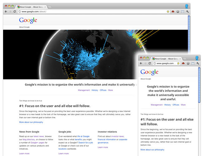 La mise à jour des techniques ci-dessus peut être visibles sur la page about de Google, ainsi que sur la page Cultural Institute de Google. Sur la page about, le contenu sera affiché vers le bas de la page dès lors que la largeur du navigateur se rétrécit, tandis que la page Cultural Institute permet d’afficher des plus grandes photos jusqu’à une largeur de pixels donnés, et qui se transformeront ensuite en une liste de miniatures au rétrécissement du navigateur.