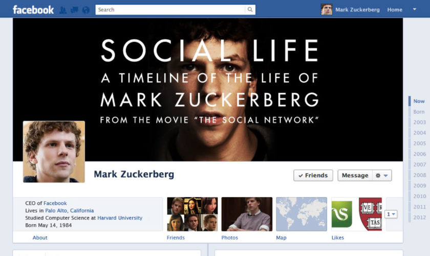 La timeline du film commence par la rupture avec sa petite-amie le poussant à créer le site Facemash, en une nuit dans sa chambre, à l’aide de l’algorithme de son ami, et de photos des filles de son collège obtenues grâce au hack de plusieurs bases de données de son université : Harvard. Tout au long de l’infographie nous allons retrouver l’histoire avec les frères Winklevii, mis en oeuvre par l’auteur à l’aide subtile fonctionnalités de Facebook, telles que le téléchargement de photos, des mises à jour de statut, des interactions Open Graph, et les lieux de check-ins afin de raconter entièrement l’histoire. Je ne suis pas sûr que le réel Mark Zuckerberg aurait été si ouvert avec toutes ces informations, mais pour l’amour de cette infographie, c’est tout assez drôle ! Regardez par vous-même :