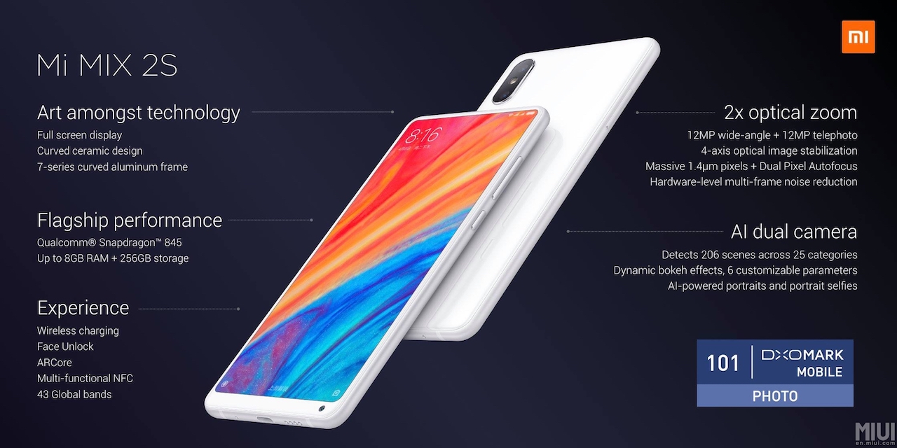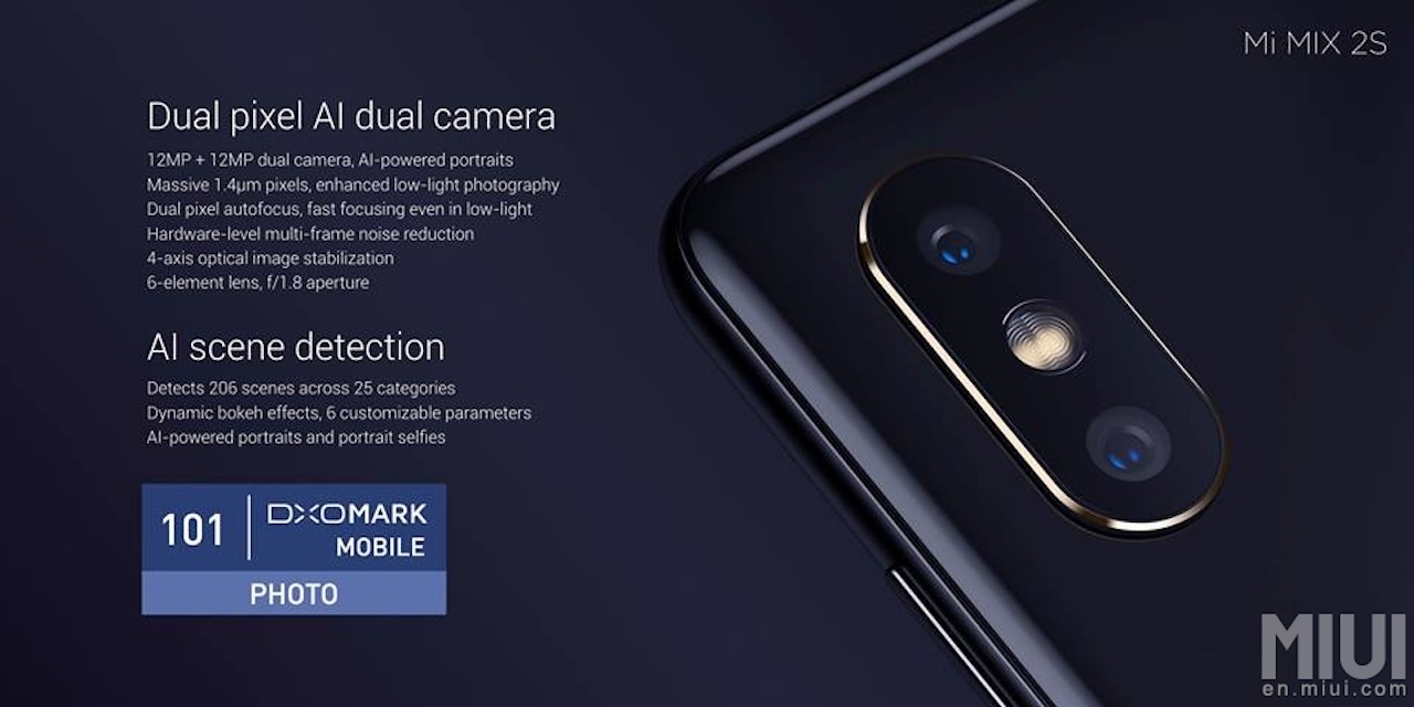 Pour la partie caméra, le Xiaomi Mi MIX 2 s est équipé d’une caméra arrière à double capteur photo, avec une lentille grand-angle de 12 mégapixels ayant une ouverture f/1.8 et un téléobjectif de 12 mégapixels avec un zoom 2x. La double caméra est également équipée d’un zoom optique, d’un mode portrait, d’une stabilisation optique 4 axes, d’une impressionnante taille de pixel de 1,4 micron, d’un autofocus et d’une réduction du bruit multitrame au niveau matériel. Le smartphone a obtenu un score de 97 points par DxOMark, ce qui en fait l’un des meilleurs photophones sur le marché.
