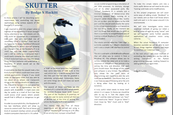 Le magazine met également en évidence un projet visant à créer un robot avec un bras et une pince qui peut être utilisé pour effectuer de simples tâches. La particularité du robot est qu’il utilise un ordinateur Raspberry PI.