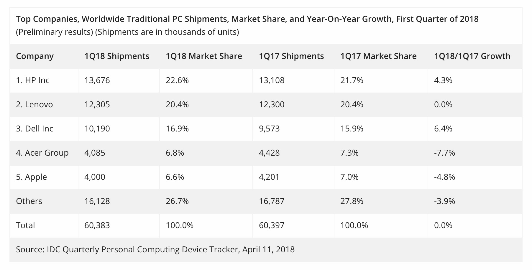 Selon IDC, le marché des PC a réussi à dépasser les attentes des analystes au premier trimestre 2018, avec des ventes qui ont atteint 60,4 millions d’unités, ce qui représente une croissance stable d’une année sur l’autre.