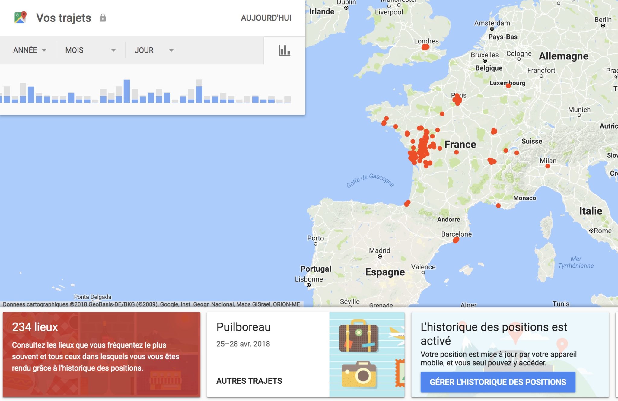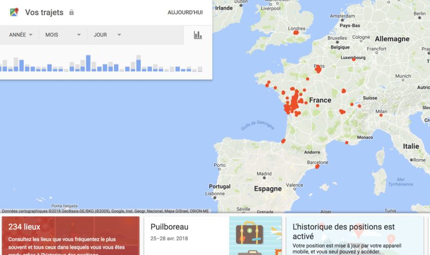 Ici, vous verrez beaucoup d’informations sur où vous avez été : vous pouvez voir vos voyages sur une carte, un lien vers vos lieux les plus visités et un lien vers tous vos voyages enregistrés. Vous pouvez parcourir les voyages par date sur le calendrier ou par emplacement. En cliquant sur une date, vous affichez vos trajets et emplacements enregistrés. En cliquant sur un emplacement, vous allez voir quand vous avez visité ce lieu pour la dernière fois.