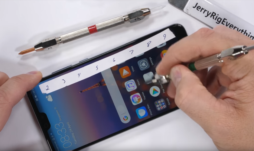 Nelson applique son traditionnel test de grattage sur l’écran du P20 Pro, et trouve que ce dernier résiste plutôt bien, notamment grâce à sa protection de verre, bien que cette dernière ne soit pas un verre Gorilla Glass de Corning. Il affirme que le verre a réussi à se classer au 6e rang dans l’échelle de Mohs, ce qui signifie que le verre est rayable à la lime ou par le sable selon Wikipedia. Cependant, il indique que cela a une sérieuse implication dans un test différent.