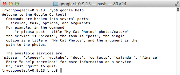 Pour exécuter une commande, vous devez inclure le service, la tâche, les options et les arguments. Les services seront picasa, docs, contacts, etc … La tâche sera des termes tels que post, edit, delete, upload, etc… et utilisera des termes tels que title, query, name. Enfin, les arguments à inclure seront des références spécifiques à des éléments tels que les noms des documents ou le chemin vers une vidéo.