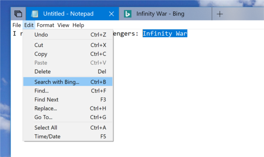 La fonction de recherche est parfaitement intégrée dans l’application Bloc-notes et peut être invoquée en sélectionnant le texte que vous souhaitez rechercher, en appuyant sur les touches Ctrl + B, en effectuant un clic droit sur le texte et en cliquant sur « Rechercher avec Bing » ou en aller dans le menu et en cliquant sur « Édition > Rechercher avec Bing ». Chacune de ces trois méthodes fonctionne très bien.