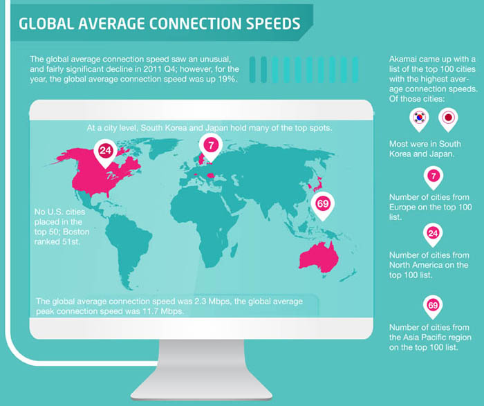 L’autre fait important que l’on peut relever sur l’infographie, concerne la vitesse de connexion moyenne mondiale. Dans le top 100 des villes, on peut constater que la région Asie-Pacifique détient le plus grand nombre de Hot Spots Internet. Les États-Unis et le Canada arrivent en seconde position avec 24 villes ayant une accès rapide. Enfin, seulement 7 villes Européennes sont répertoriées, mais malheureusement aucune en France…