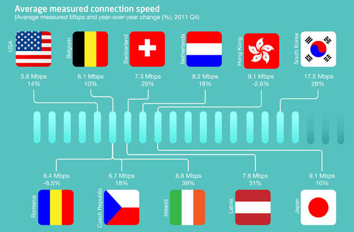 Ils ont également eu l’information sur la vitesse de connexion moyenne la plus élevée, et ce en faisant un savant calcul pour les dix plus grosses vitesses moyennes avec la variation en pourcentage. La Corée du Sud ouvre la voie avec un débit de 17,5 Mbps, en augmentation de 28% par rapport à l’an dernier. La France n’est même pas répertoriée dans cette statistique… On est clairement à la bourre par rapport à nos pays voisins tels que la Belgique ou encore la Suisse pour lesquels le débit est respectivement de 6,1 et 7,3 Mbps.