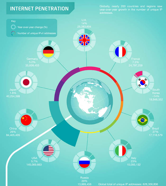 Les informations obtenues à partir de ce rapport trimestriel est en fait assez intéressant. Les États-Unis ouvrent le bal puisqu’il s’agit du premier IP en termes d’adresse IP, c’est-à-dire de la mise en place d’une ligne Internet avec plus de 145 millions d’abonnés. La Chine suit avec plus de 84 millions d’abonnées, mais possède le pourcentage le plus élevé concernant le changement (26%). D’ailleurs, on peut relever que les adresses IP uniques acquises dans les 10 premiers pays représentent en fait 67% des adresses IP globales ! Quant-à la France, celle-ci se classe sixième avec (seulement) 24 millions d’abonnés à Internet. On pourra relever un bon pourcentage de 7.6% de changement à l’année.