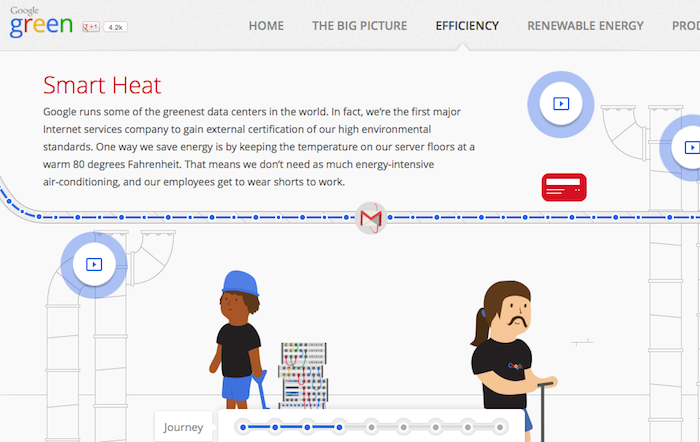 La vidéo se veut plus être comme un coup d’œil sur la façon dont Google a pris des mesures extrêmes pour réduire son impact sur l’environnement, en particulier pour ses centres de données. La firme en a profité pour développer un site Web interactif sur lequel vous pouvez suivre peu à peu le trajet d’un e-mail, et sur lequel vous pouvez cliquer sur les photos et la vidéo décrivant la technologie verte de Google. L’ensemble du projet a été surnommé le “Story of Send”.