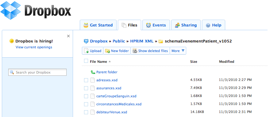 La capture d’écran ci-dessous, est l’interface Web de Dropbox. Elle présente la liste des fichiers d’un répertoire. De là les actions les plus courantes sont possibles : téléchargement de fichiers, ajout d’un dossier et d’un fichier, suppression des fichiers, etc…