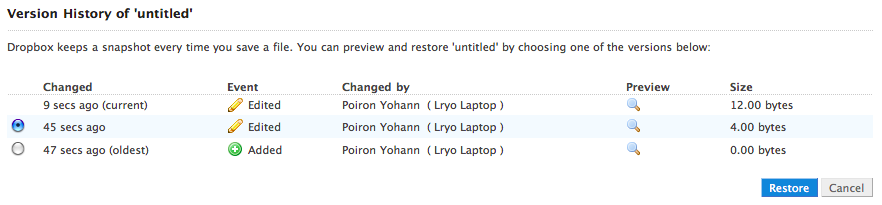 Dropbox conserve également un enregistrement des versions précédentes du fichier, de sorte qu’il fonctionne comme son propre contrôle de version du système même, un bonheur !