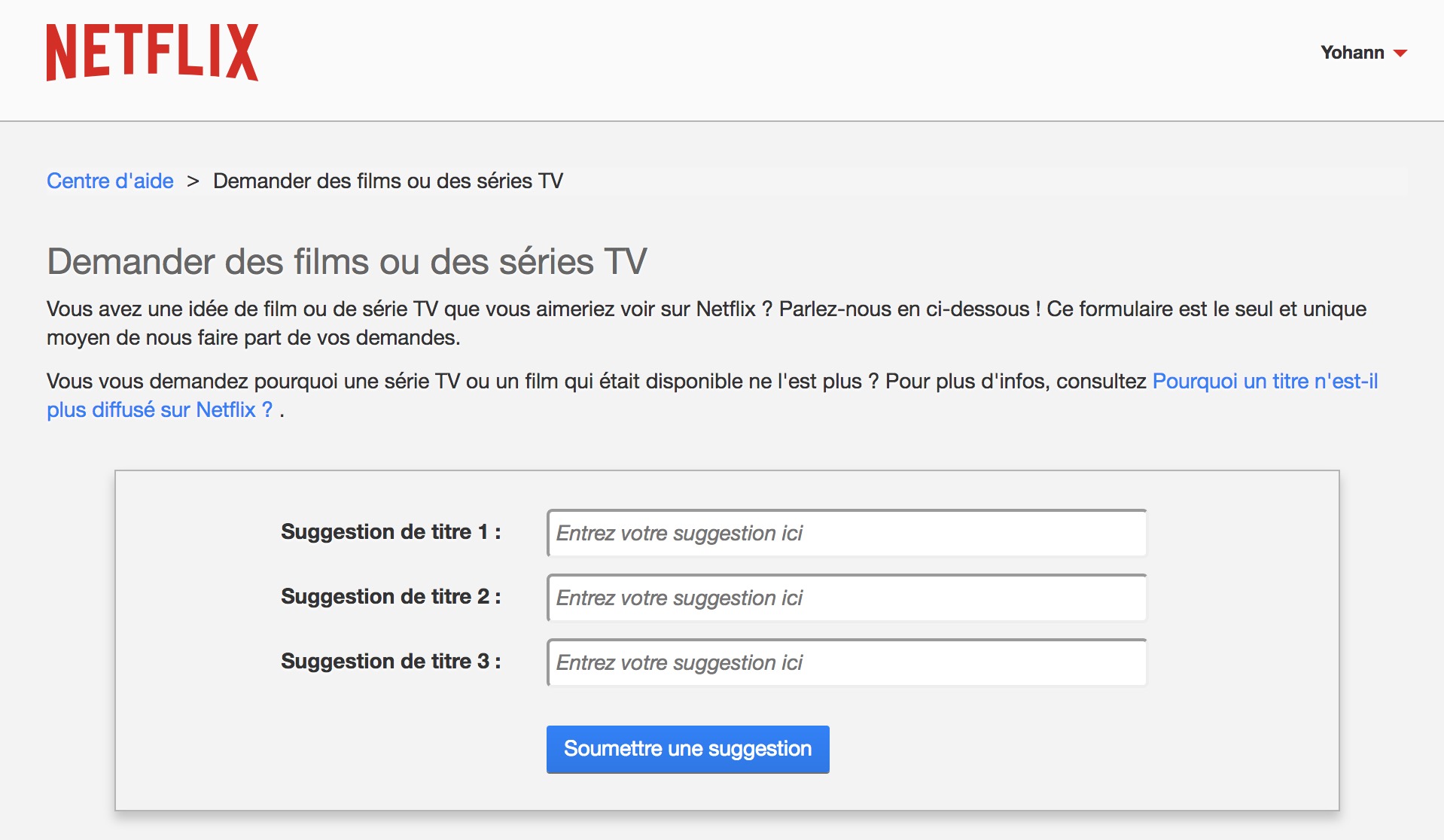 Netflix a un formulaire « Demander des films ou des séries TV » sur sa page d’aide. Non, je ne le savais pas, et je pense que je n’étais pas le seul. Mais, c’est bien la page à aller si vous avez une idée de film ou de série TV que vous aimeriez voir sur Netflix. Ce formulaire est le seul et unique moyen de faire part de vos demandes.