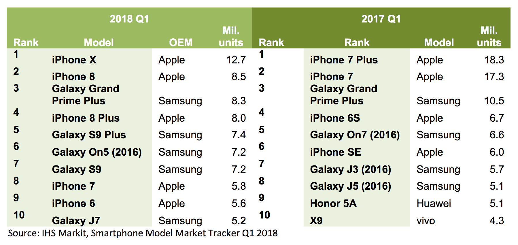 Mais malgré cette forte performance, Apple a vendu moins de nouveaux iPhone cette année par rapport à la même période en 2017. IHS Markit affirme qu’Apple a expédié un total de 35,6 millions d’iPhone 7 et iPhone 7 Plus l’année dernière, alors que les ventes de l’iPhone X et l’iPhone 8 ont « seulement » atteint le seuil de 21,2 millions d’unités.
