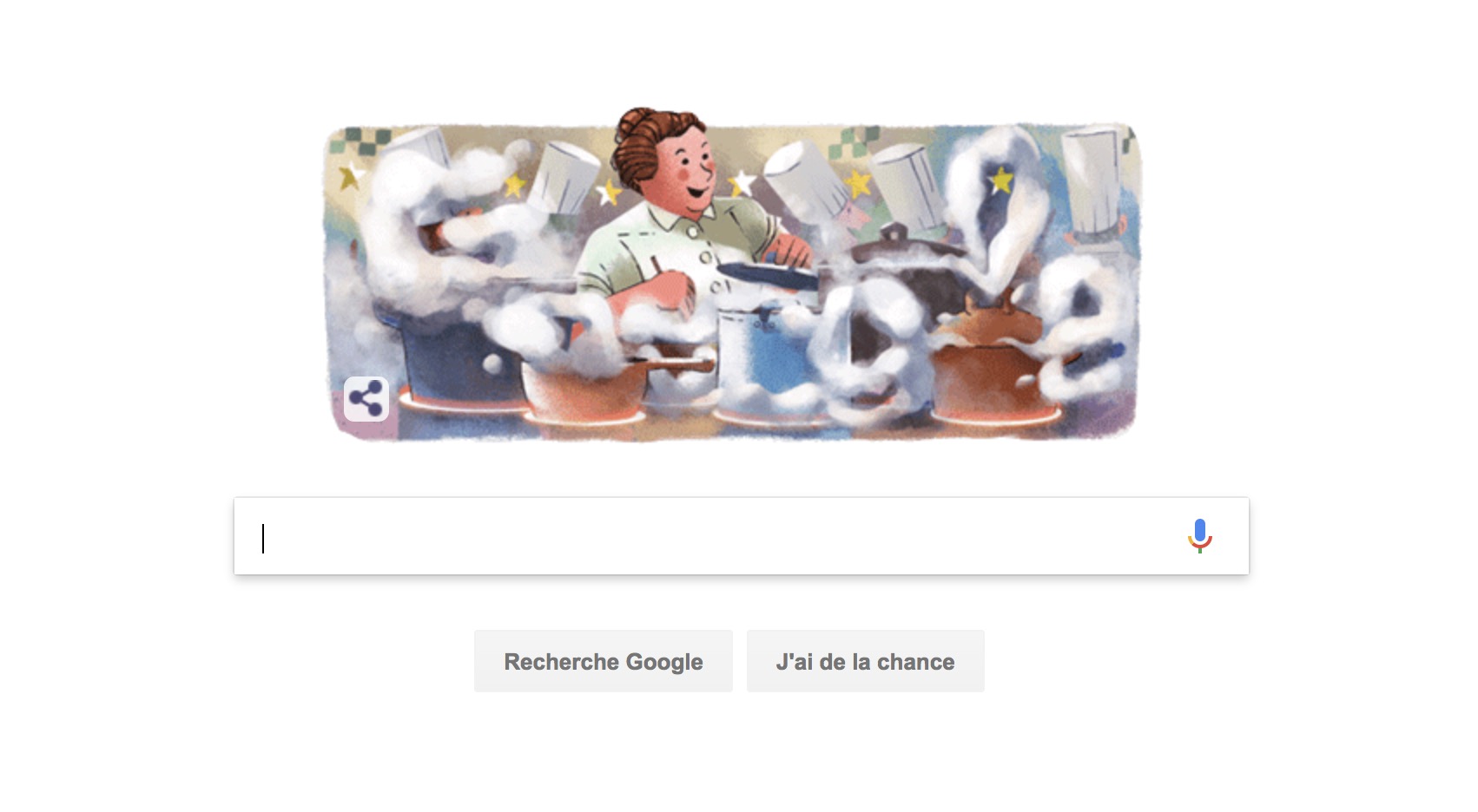 Décrite comme « la mère de la cuisine française » et saluée pour sa cuisine fraîche et simple, Eugénie Brazier aurait fêté son 123e anniversaire ce mardi 12 juin. En son honneur, Google change son logo dans 11 pays par un doodle, qui permet de mettre à l’honneur cette femme qui est la première à avoir obtenu 3 étoiles au précieux guide Michelin. Le logo du géant de la recherche par la vapeur qui se dégage des marmites.