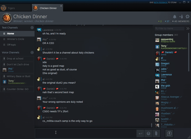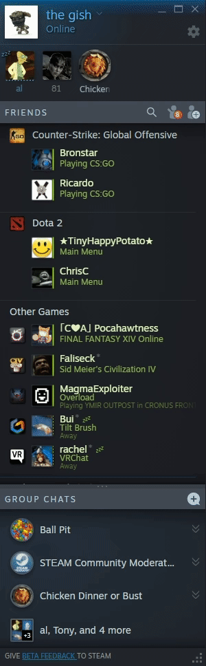 La dernière version bêta de Steam a mis en place un tout nouveau système de chat et modernise le côté communication de Steam. Clairement inspiré des services de messagerie à la mode, le nouveau système de chat de Steam ajoute des chats de groupe, refond les listes d’amis, ajoute le support pour les vidéos et les GIF, et chiffre son nouveau système de chat vocal.