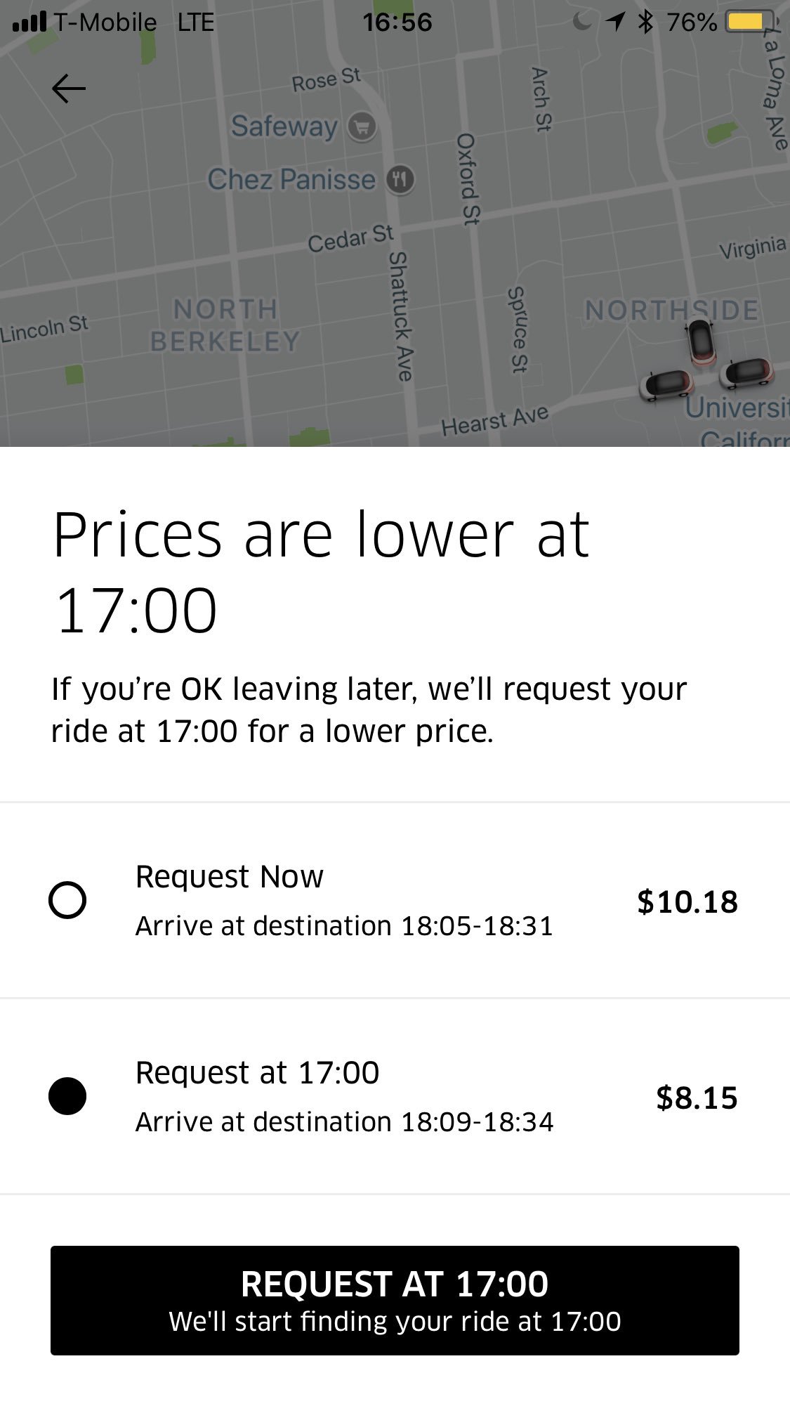 Peu importe, nous avons un aperçu de ce qui pourrait être un futur moyen d’économiser de l’argent tout en aidant Uber à jongler avec la disponibilité de ses chauffeurs. Quelqu’un qui souhaite réserver un chauffeur, mais qui n’a pas besoin de partir dès que possible peut choisir d’attendre un peu plus longtemps en échange d’un tarif plus bas. Ou, si ce n’est pas possible, ils peuvent demander un trajet immédiat et payer le prix le plus fort.