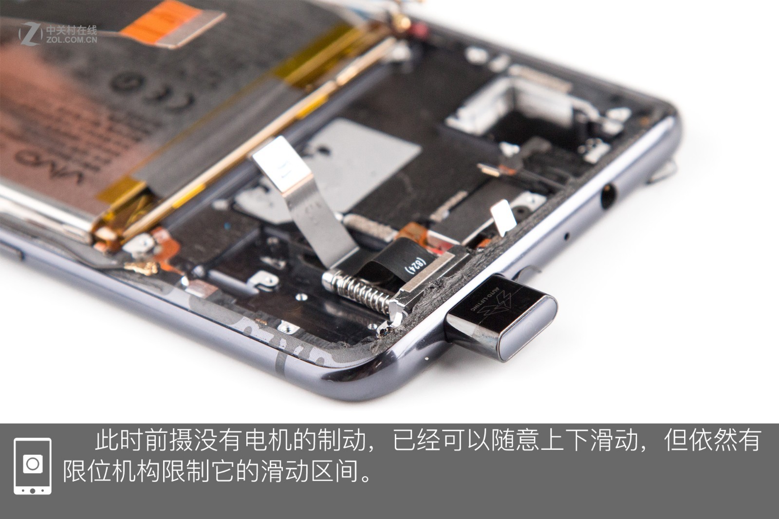 Dans les différents clichés pris lors du démontage, vous pouvez voir tous les mécanismes et les composants qui rendent le mouvement de slide-up possible sur la caméra frontale. Certes, il y a un ressort, mais c’est en fait la spirale en argent à droite qui pousse la caméra vers le haut. Tout semble parfaitement bien pensé, mais les parties mobiles sont par définition des pièces mobiles et donc plus sujettes à se détériorer.