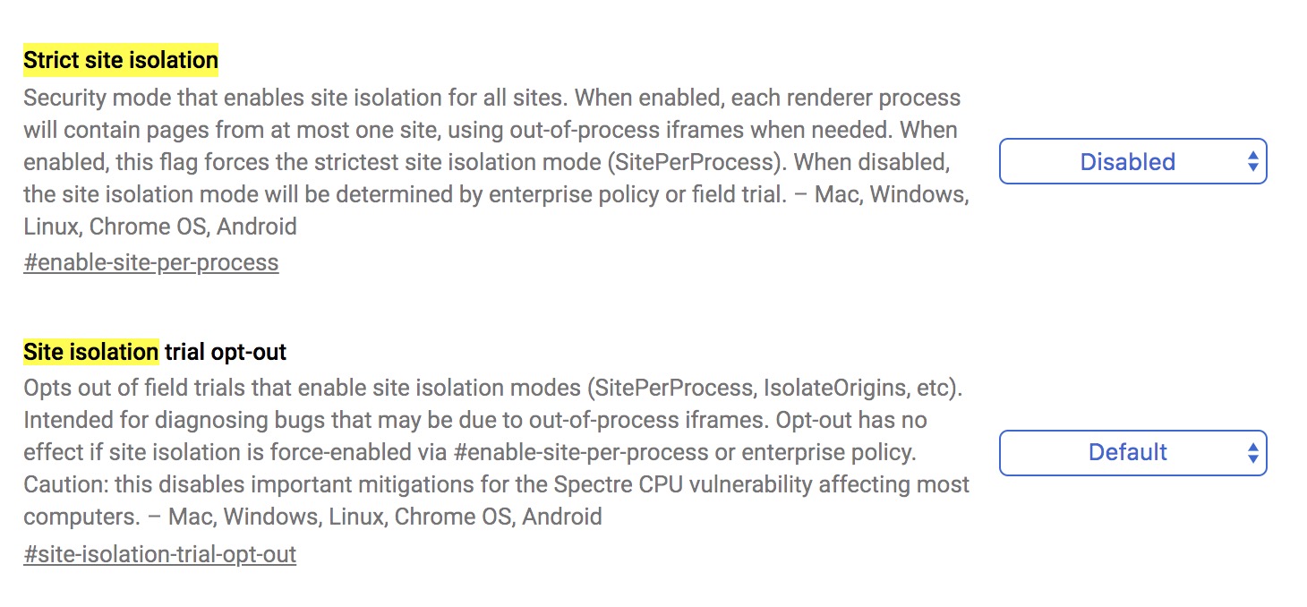 Pour vérifier si cela est activé, ou le désactiver si vous le décidez (ce que je ne vous recommande pas), vous pouvez aller sur chrome://flags#enable-site-per-process dans votre barre d’adresse, puis de définir d’activer ou non l’option « Strict site isolation ».