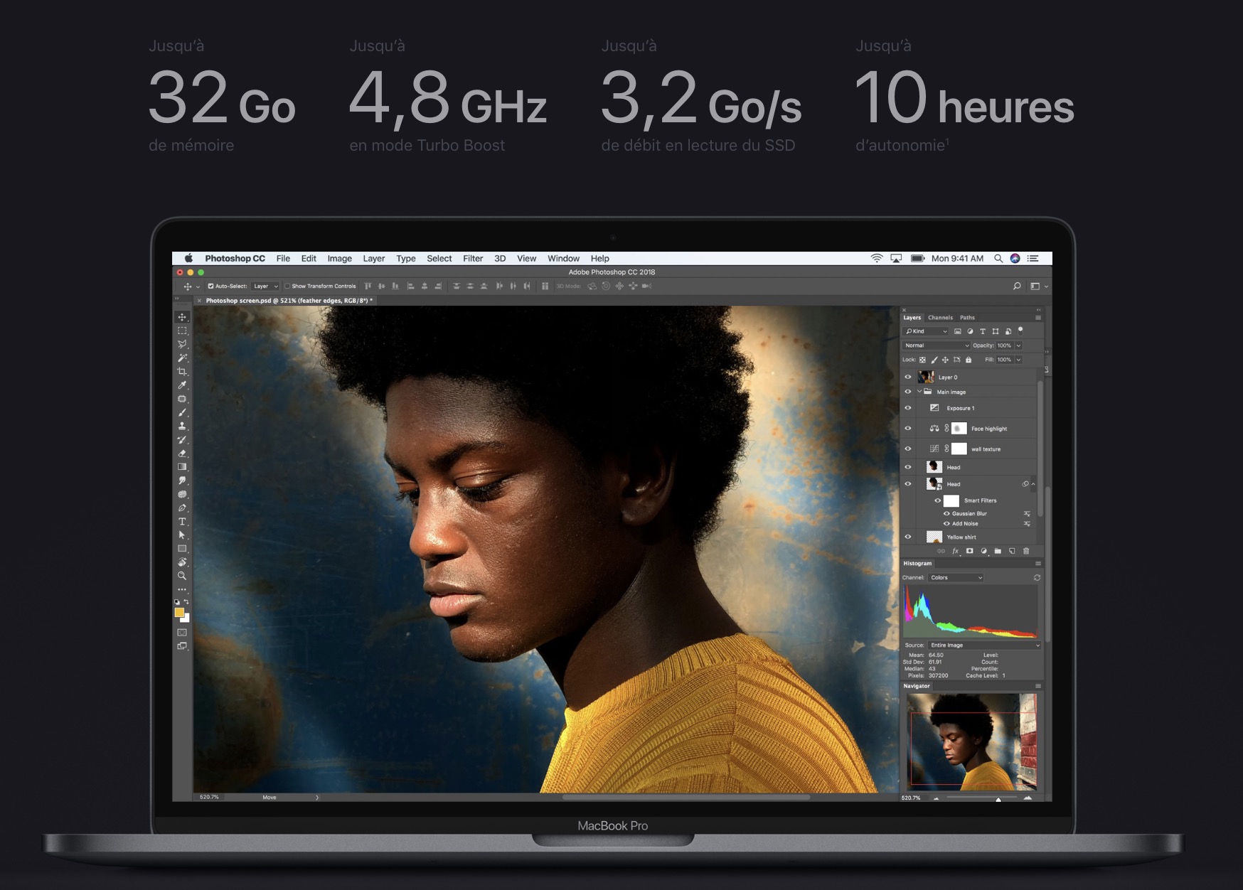 Ainsi, vous retrouvez des processeurs Intel Core de 8e génération, la version 15 pouces offrant un choix de processeurs Intel Core i7 ou Core i9 à 6 cœurs jusqu’à 2,9 GHz, avec un mode Turbo Boost cadencé à 4,8 GHz.