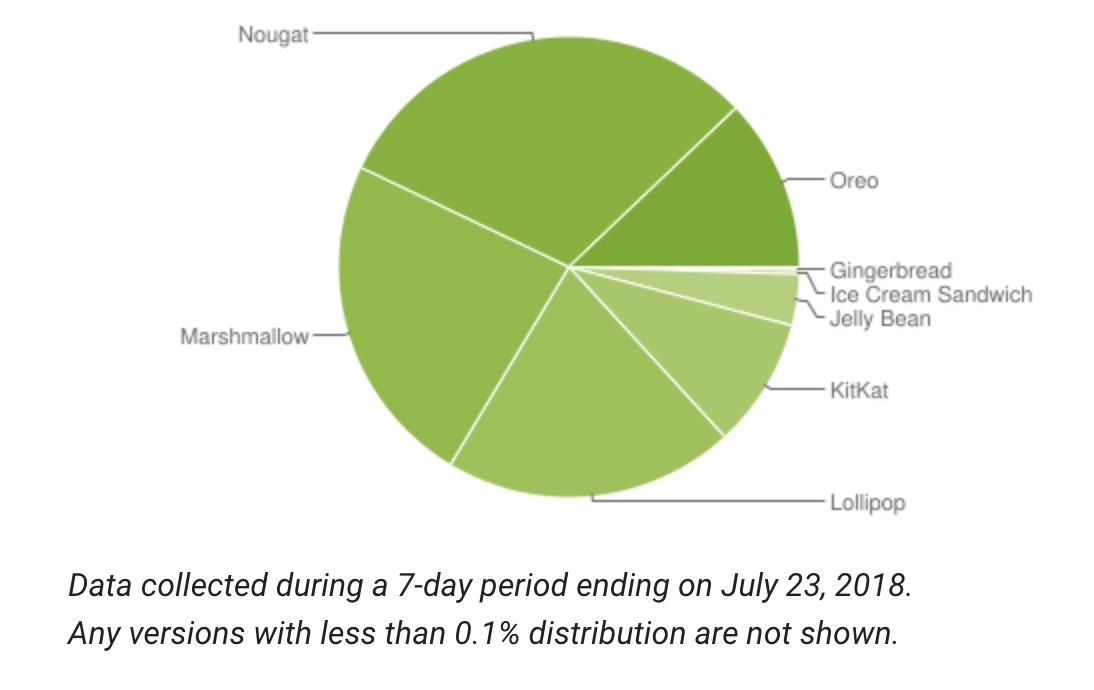 L’ordre d’adoption d’Android est maintenant le suivant : Nougat en première place, Marshmallow en deuxième place, Lollipop en troisième, et Oreo seulement en quatrième position. Il faudra encore quelques mois avant que Oreo ne puisse entrer dans le top trois. À titre de comparaison, la dernière version d’iOS, le système d’exploitation mobile d’Apple, est adoptée par 81 % des utilisateurs (une mesure prise le 31 mai 2018 !).