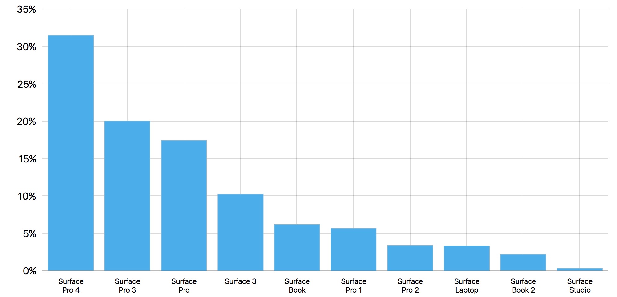 En ce qui concerne les modèles Surface, la Surface Pro 4 est le premier appareil avec 31,47 % de périphériques mis à jour à la dernière version de l’OS, tandis que la Surface Pro 3 arrive en seconde position avec une part de 20,01 %.
