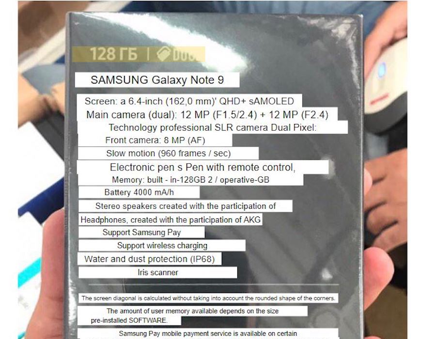 Cependant, cette nouvelle fuite dépasse ces dernières, car elle révèle pratiquement toutes les spécifications du futur Galaxy Note 9. La photo de la l’arrière de la boîte a été prise dans un magasin russe et, naturellement, tout était en russe. Heureusement, SamMobile a traduit celle-ci.