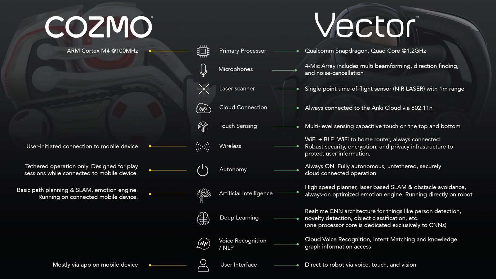 Le robot nommé Vector est très analogue à Cozmo dans ses fonctions les plus élémentaires. La première, et peut-être la plus grande différence, réside dans le manque criant d’avoir constamment besoin d’un smartphone. Alors que le robot Cozmo a besoin d’un smartphone pour démarrer, commander et écouter, ce nouveau robot Vector n’a besoin que d’un smartphone pour son tout premier processus d’installation.