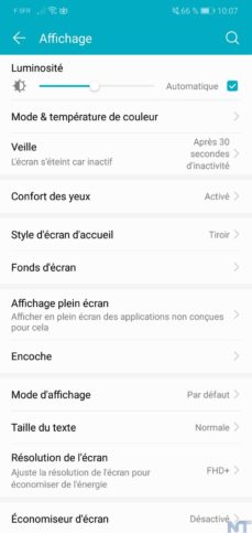 Honor inclut de nombreuses options de personnalisation pour l’écran. Vous pouvez programmer un filtre de lumière bleue pour les modes nuit/jour. Vous pouvez basculer entre plusieurs modes pour la couleur globale — plus chaud ou plus froid, selon votre goût. Une option ici modifie également la résolution de l’écran — au cas où vous souhaiteriez vous limiter à la résolution 720p.