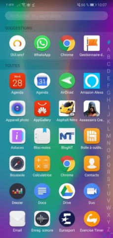 Pour le côté logiciel, on retrouve la propre surcouche EMUI de Huawei, une interface utilisateur conçue pour modifier Android. Vous pouvez très facilement télécharger et utiliser un autre lanceur si vous le souhaitez, bien que les utilisateurs d’EMUI n’auront pas trop de mal pour s’y habituer. Cette nouvelle version d’EMUI a la capacité d’utiliser un tiroir d’applications, contrairement aux précédentes versions.