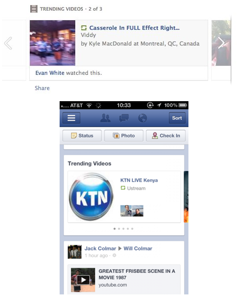 Hier, Facebook a annoncé une nouvelle caractéristique semblable à celle pour les articles tendances, nommée “vidéos tendances” ! Celle-ci va également s’intégrer dans le flux d’actualités, sur la base de ce que vos amis ont regardé, et ce via des applications vidéo connectées à l’Open Graph de Facebook. Ci-dessous une capture d’écran de l’interface, pour la version de bureau et mobile :
